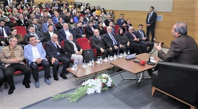 Daha sonra kürsüye çıkarak konuşmasına başlayan 59, 60, 61 ve 62. dönem olmak üzere ard arda dört kez Gıda, Tarım ve Hayvancılık Bakanlığı görevini yürüten Mehdi Eker, Türkiye’de yaşayan özellikle gençlerin yakın tarihi iyi okumaları gerektiğine vurgu yaparak “Bakanımın daveti üzerine sizlerle tanışmak, konuşmak için geldik buralara. Tabii ki öncelikli amacımız gelecek tasavvuru. Öncelikle geçmişimizi, tarihimizi iyi bilmemiz lazım. Geriye dönüp bakıp gelecek ile ilgili tasavvurumuzu ondan sonra değerlendirmek ve neticelendirmemiz gerekir.” dedi.Batı dünyası ile Ortadoğu’da yaşanan sıcak gelişmeler hakkında da bilgiler veren Eker, Ortadoğu’nun Türkiye’yi yakından ilgilendirdiğini söyleyerek “hem günceli, hem aktüel olanı, hem de tarihsel olanı göz önüne alarak burada neticelendirmemiz gerekir. Birlikte tahlil edip gelecek ile ilgili bir fotoğraf oluşturulabilir. Son 100 yılda batı sisteminin yol açtığı, başlatmış olduğu iki dünya savaşı yaşandı. Bu savaşlarda toplamda kabaca 80 milyon insan öldü. 2. Dünya Savaşı Avrupa’nın kendi arasındaki savaştır. Rekabet, liderlik, birbirinden güç alma savaşıydı. Tabiri caizse bir paylaşma savaşıydı. Avrupalılar bir daha savaşmamak için bütünleşti adına Avrupa Birliği Projesi denildi. 1. Dünya Savaşı ne oldu? Bu savaş halen daha devam ediyor. Bu sorunun cevabı bu savaşın hedefinde kimlerin olduğu ile alakalıdır” şeklinde konuştu.Konferans, karşılıklı soru cevapların yöneltilmesi ve Başkan Özlü’nün Eker’e çiçek, hediye takdim etmesinin ardından sona erdi.