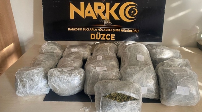 düzce Cumhuriyet Başsavcılığı uyuşturucu madde ticareti yapma suçu kapsamında yürütülmekte olan soruşturma kapsamında Narkotik Suçlarla Mücadele Şube Müdürlüğü tarafından yürütülen çalışmalarda; TEM otoyolunda durumundan şüphelenilip durdurulan araçta ve araçta bulunan N.R. ve A.D. isimli şahısların yapılan üst aramasında; 17 parça halinde toplam 10 kilogram Esrar maddesi ile suçtan Elde Edildiği Değerlendirilen 3 bin 765 TL ele geçirildi. İki şahıs Uyuşturucu Madde Ticareti Yapmak suçundan gözaltına alındı