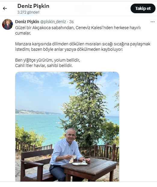 Akçakoca Kaymakamı Deniz Pişkin, sosyal medya hesaplarından yaptığı şiirli paylaşım dikkat çekti.Ceneviz kalesinde kahve içerken kendi fotoğrafını paylaşan Pişkin, şu sözleri yazdı:"Güzel bir Ağustos sabahından, Akçakoca Ceneviz Kalesi’nden herkese günaydın ve hayırlı cumalar.Şöyle manzaraya karşı oturunca dilimden iki mısra dökülüverdi. Bazen böyle anlık gelen mısraları yazmayıp unuttuğum çok olmuştur. Sonra “Neydi, nasıldı?” diye düşünüp durmak yerine, sıcağı sıcağına, fırından yeni çıkmış taze simit misali sizinle paylaşmak istedim:Ben yiğitçe yürürüm, yolum bellidir,Cahil itler havlar, sahibi bellidir."İşte o paylaşım: