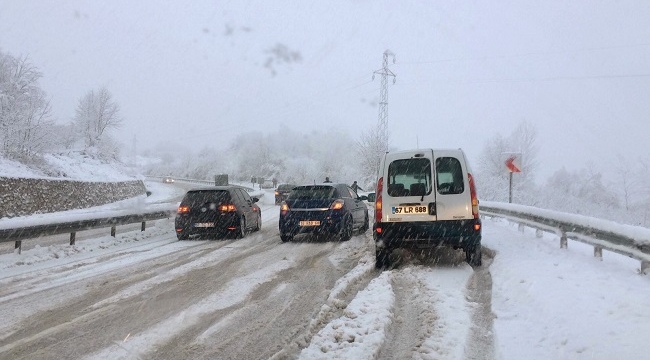 Kar yağışı nedeniyle düzce Akçakoca karayolunda ulaşım güçlükle sağlanıyor.