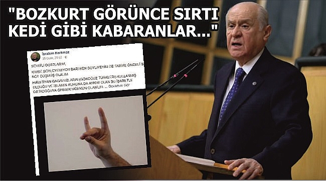 MHP Lideri Devlet Bahçeli, bugünkü grup toplantısında eski düzce Milletvekili İbrahim Korkmaz’a çok sert yanıt verdi.Düzce Üniversitesi öğretim üyesi ve AK Parti eski milletvekili İbrahim Korkmaz, Afrin harekatında Mehmetçik ve ÖSO mensuplarının Bozkurt işareti yapmalarından rahatsız olmuş, Bozkurt işaretinin Hırıstiyan Gagavuzların kullandığını ve İslam’ın ruhuna aykırı olduğunu iddia etmişti.