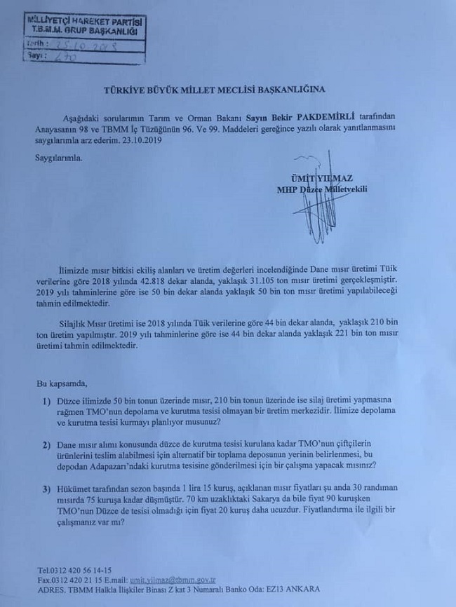 Vekil Yılmaz, Düzce'de mısır depolama ve kurutma tesisinin olmadığını belitirken mısır fiyatının düşüşe geçmesinin nedenini sordu. Yılmaz'ın Tarım ve Orman Bakanı Bekir Pakdemirli tarafından yazılı olarak yanıtlanması için meclis başkanlığına sunduğu soru önergesi şöyle: