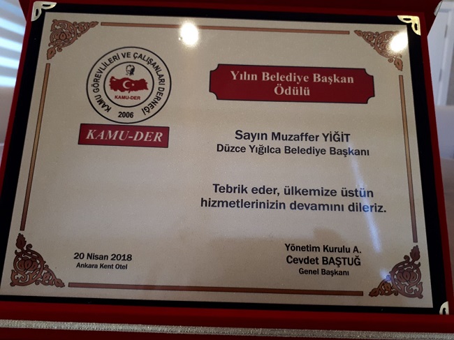Ankara’da gerçekleşen Kamu-Der ödül töreninde ilçede yapılan çalışmalardan dolayı ve Başkan Yiğit’in ‘göz nurum, mega projem’ dediği Melen Turizm Vadisi projesinin resmi anlamda olarak başlamasından dolayı KAMU-DER tarafından Yılın belediye başkanı ödülü takdim edildi.