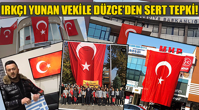 Brüksel’de düzenlenen AP Genel Kurulu’nda ırkçı yunan vekil Loannis Lagos, kürsüde Türk bayrağını yırttı. Lagos yaptığı terbiyesizlik büyük tepki çekerken, Vekil Lagos’a Düzce’den tepkiler çığ gibi büyüyor. Türk Bayrağı'nın yırtılmasına yurtg enelinde olduğu gibi Düzce'den de tepki yağdı.Düzce Belediyesi, Türk halkına yönelik yapılan hadsiz saldırı sonrası Belediye binasına dev Türk Bayrağı asarak Yunun Vekili kınadı. Yapılan çirkin saldırı sonrası Kaynaşlı Belediyesi tarafından da belediye binasına dev Türk Bayrağı asılsı.Kaynaşlı Belediye Başkanı Birol Şahin konuyla ilgili yaptığı açıklamada, Şanlı bayrağımıza uzanan elleri dün olduğu gibi bugünde kırarız. Yunan' ın kendini bilmez ırkçıları haddini bilsin. Bayrağımız her yerde dalgalanmaya devam edecek.Tüm esnaflarımızı ve vatandaşlarımızı Bayrağımızı asmaya davet ediyorum.” ifadelerine yer verdi.Düzce MHP İl Teşkilatı ise yapılan bu çirkin saldırı sonrası il başkanlığı binasına dev Türk Bayrağı asarak Yunan Vekilin Türkiye’ye karşı gerçekleştirdiği hadsiz davranışı kınadı.AK Parti ve diğer partilerin yanı sıra, sivil toplum kuruluları da tepki gösterdi.Düzce Cumhuriyet Anadolu Lisesi ise sosyal medya hesabı üzerinden Türk Bayrağı ile çekilen fotoğraf paylaştı. “Bayrakları bayrak yapan üstündeki kandır. Toprak uğrunda ölen varsa vatandır” sözlerine paylaşımda yer veren Düzce Cumhuriyet Anadolu Lisesi öğrencileri çirkin saldırıyı kınadı.