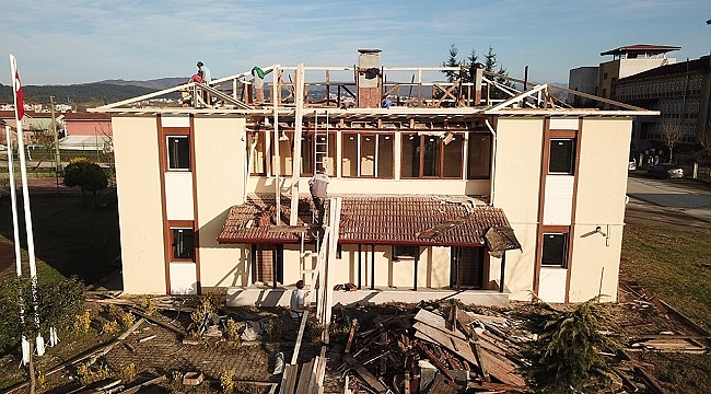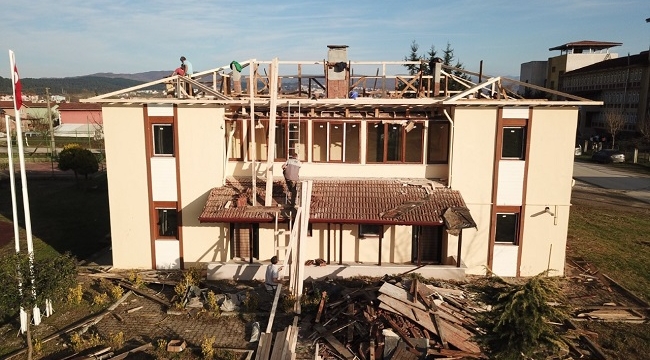 Düzce Belediyesi, başlattığı mahalle konakları projelerini bir bir hayata geçiriyor. Bir süre önce tadilatına başlanan Beyciler Mahalle Konağının çatısı onarılıyor.