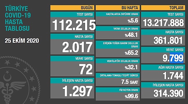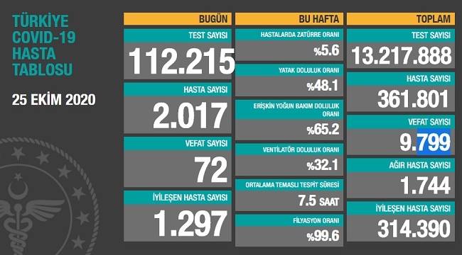 25 Ekim gününün korona virüsü tablosuna göre, son 24 saatte 72 kişinin hayatını kaybetmesi sonucu can kaybı 9 bin 799 oldu.Sağlık Bakanı Fahrettin Koca: Bugün tespit edilen 2.017 yeni hasta var. Ağır hasta sayımız ve aktif hasta sayımız artmaya devam ediyor. Bu gidişatı değiştirmek bizim elimizde. Mücadeleyi bize kazandıracak olan birbirimizin hakkına saygı duymak ve tedbirlere birlikte uymaktır.