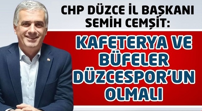 CHP düzce il başkanı semih cemşit Düzce Belediyesi'nin ihaleye çıkardığı kafeterya ve büfelerin, Düzcespor'a verilmesinin en doğru karar olduğunu dile getirdi.Cemşit, "Düzcespor’un şampiyonluğa doğru gittiği şu dönemde, kulüp yönetiminin ekonomik sıkıntıya düşmemesi ve hedefe ulaşmak için sabit bir gelire sahip olması önemli bir husustur. Bizlerde Düzce merkezde bulunan Millet Bahçesi içerisindeki kafeterya ve büfelerin işletmesinin, kulübe verilmesinin en doğru karar olduğunu düşünmekteyiz. Öte yandan Düzcespor’un Türkiye’deki 5 borçsuz kulüpten biri olmasındaki başarısının ise başkan Gökhan Kapoğlu’ndan kaynaklı bir durum olduğu herkesçe bilinmektedir. Kulüp yönetimi 3 dönemdir bütün masraflarını kendi bütçesinden karşılamakta olup, bundan sonraki süreçte de sabit bir gelirinin olması, marka değerimiz olan kulüp için önem arz etmektedir. Bu sebeple Düzcespor'un sürekli bir gelire kavuşması için en doğru adım kafeterya ve büfelerin işletmesinin kulübe verilmesi olacaktır.’’