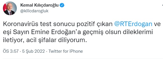 Cumhurbaşkanı Recep Tayyip erdoğan ile eşi Emine Erdoğan koronavirüse yakalandı.CHP Genel Başkanı Kemal Kılıçdaroğlu, Erdoğan ve işeni "geçmiş olsun" mesajı dedi.Kılıçdaroğlu, "Koronavirüs test sonucu pozitif çıkan Erdoğan ve eşi Sayın Emine Erdoğan’a geçmiş olsun dileklerimi iletiyor, acil şifalar diliyorum" ifadelerini kullandı.