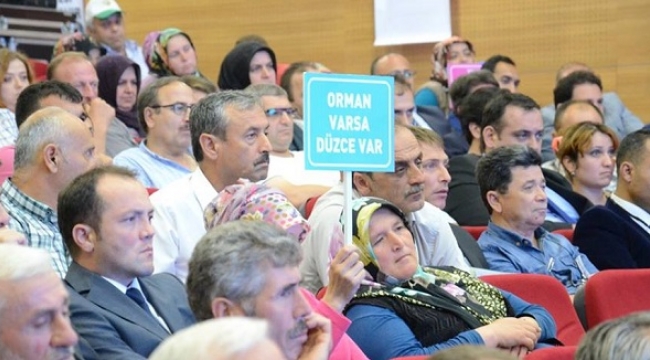 Orman ve Su İşleri Bakanı Veysel Eroğlu'nun Düzce ziyaretindeki toplantıda, bir kadın tarafından "Orman varsa Düzce var" yazılı pankart açılarak anlamlı mesaj verildi.