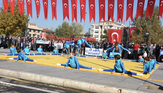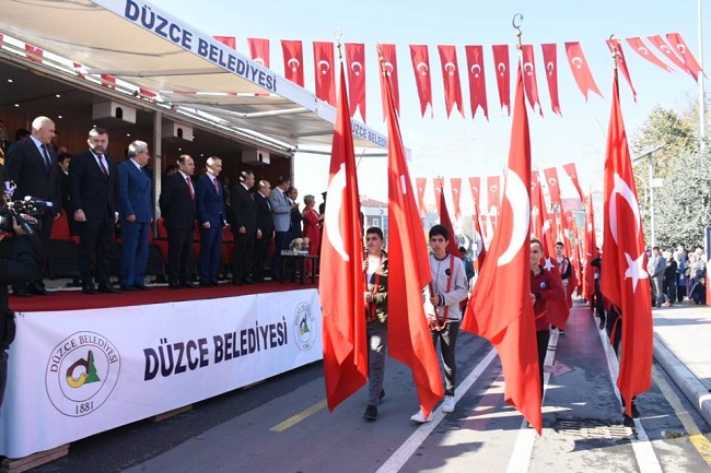 Günün anlam ve önemine ilişkin konuşmaların ardından tören, öğrenciler tarafından cumhuriyeti konu alan şiir ve kompozisyonların okunması, Düzce Belediyesi Mehteran takımının gösterisi ile devam etti.