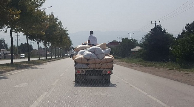 Düzce’de Karayolu üzerinden seyir halinde bulunan fındık yüklü kamyonet üzerindeki bir kişi ile trafikte seyir etmesi şaşırttı. Fındık çuvallarının üzerinde canını hiçe sayan kişi ise pes dedirtti.
