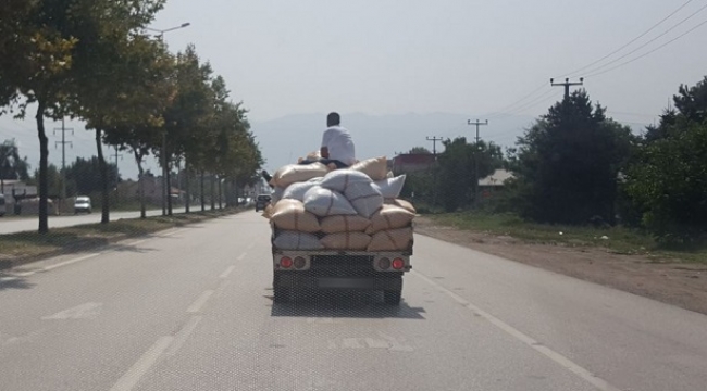Düzce’de kamyonet üzerine konulan çuvalların üzerinde oturan adam yürekleri ağza getirdi.