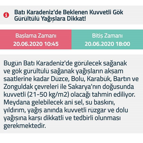 Meteoroloji, Düzce, Bolu, Karabük, Zonguldak, Bartın ae Sakarya için çok kuvvetli yağış ve su baskını uyarısı yaptı.Meteroloji'nin uyarısına göre, şiddetli ve etkili yağış dalgası akşam saatlerine kadar devam edecek. Yağışla, kuvvetli ve gök gürültünü sağanak şeklined olacak.Vatandaşların medyana gelebilecek ani su ve sel baskını ve yıldırım düşmesine karşı dikkatil olması istendi.