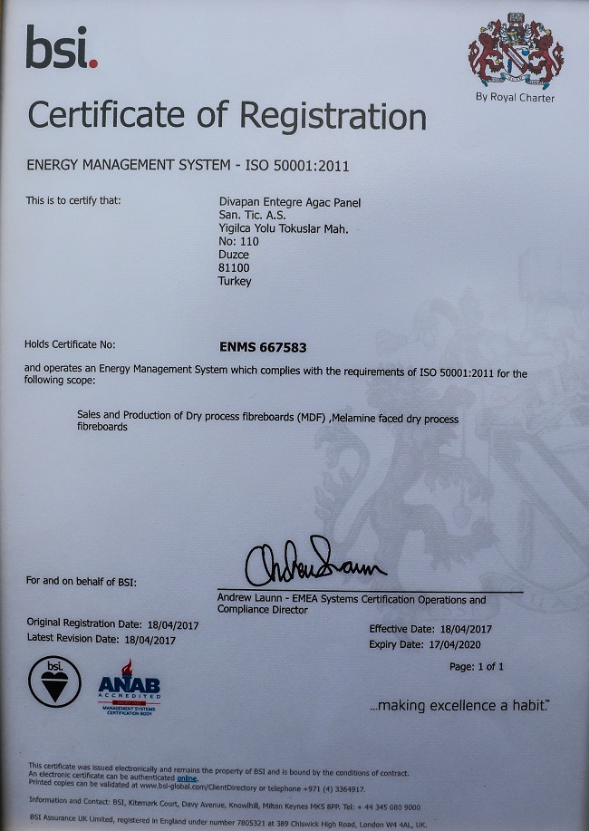 Enerjide verimli sanayi kuruluşlar arasında 3 yıllık veriler dikkate alınarak kendi sektöründe geçen yılın birincisi olan divapan firması iso 50001 Enerji Yönetim Sistemi belgesini de alarak sektöründe öncü olmaya devam ediyor.
