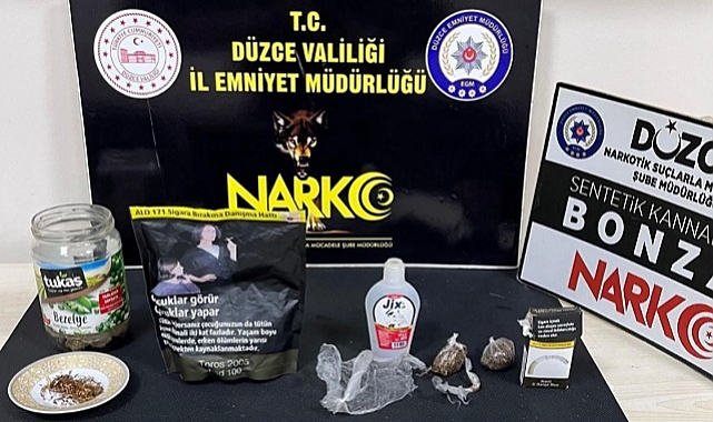 Düzce'de düzenlenen uyuşturucu operasyonunda 35 gram bonzai ele geçirildi, 1 kişi tutuklandı.Düzce Cumhuriyet Başsavcılığı koordinesinde Narkotik ekiplerince Camikebir Mahallesinde bir şahsa yönelik operasyon düzenlendi. Yapılan aramada 8 parça halinde toplam daralı ağırlığı 35 gram gelen bonzai maddesi ele geçirildi.Uyuşturucu madde ticareti yapmaktan gözaltına alınan 9 suç kaydı bulunan U.Ö. İsimli şahıs sevk edildiği mahkemece tutuklandı.