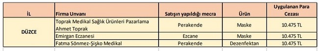 Ticaret Bakanlığı, Reklam Kurulunca Düzce'de ceza kesilen, Kovid-19 salgını nedeniyle talebi artan ürünlerde fahiş fiyat uygulayan firma isimlerini açıkladı.Ticaret Bakanlığı fahiş fiyat artışı yapan 198 firmaya 10 milyon Türk Lirası ceza kesti. Dün Ticaret Bakanı Ruhsar Pekcan yaptığı açıklamada, "281 firmanın 191'ine fahiş fiyat cezası kesildi. Firmaları afişe etmedik, 2 Nisan'da yayınlanacak." demişti.Ticaret Bakanlığı, Reklam Kurulunca ceza kesilen, Kovid-19 salgını nedeniyle talebi artan ürünlerde fahiş fiyat uygulayan firma isimlerini açıkladı.Buna göre Düzce'de Toprak Medikal Sağlık Ürünleri Pazarlama Ahmet Toprak, Emirgan Eczanesi ve Fatma Sönmez Şişko Medikal'e 10 Bin 475'er lira para cezası kesildi. İşte Düzce'de ceza kesilen o firmalar;