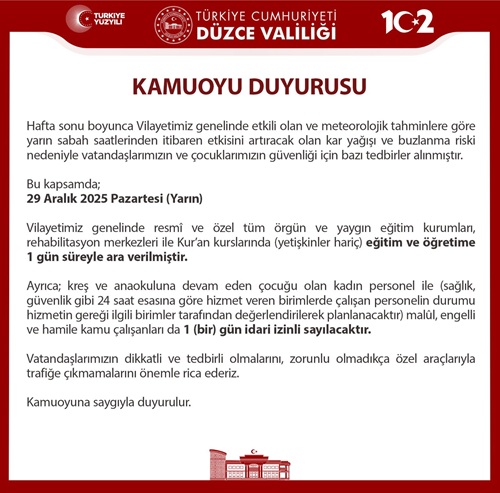 Düzce Valisi Selçuk Aslan, beklenen kar yağışı sebebiyle 29 Aralık 2025 pazartesi günü il genelinde resmi ve özel okulların 1 gün süreyle tatil edildiğini bildirdi.Vali Aslan, yaptığı açıklamada, "Sevgili öğrenciler, Beyaz bir örtü gibi şehrimizi saran kar, bugün sizlere küçük bir mola armağan ediyor. Bu tatil; dinlenmek, pencerenizden karı izleyip hayal kurmak için güzel bir fırsat. Karın sevincini yaşayın ama sağlığınızı ve güvenliğinizi de ihmal etmeyin. Kitaplarınız sizi bekler, okulunuz sizi özler; öğretmenleriniz de yeniden aynı heyecanla buluşacakları günü sabırsızlıkla beklerler. Hepinize huzurlu, mutlu ve sıcacık bir kar tatili diliyorum." dediValilik'in resmi duyurusu şöyle: