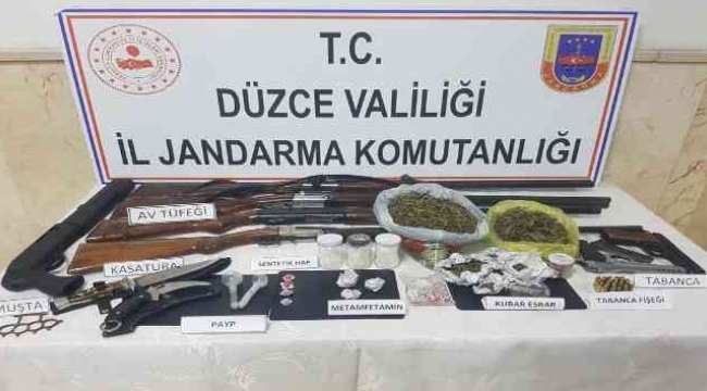 Bir ihbar üzerine harekete geçen düzce Jandarma Komutanlığı ekipleri, Nusrettin Mahallesinde ikamet eden iki şüphelinin uyuşturucu madde ve silah ticareti yaptıkları tespit etti.Şahısların ev ve eklentilerinde yapılan aramada 2 adet 9 milimetre çapında tabanca, 23 adet 9 milimetre çapında fişek, 2 adet 7,65 milimetre çapında tabanca fişeği, 5 adet av tüfeği, 1 adet kasatura, 1 adet hançer, 1 adet muşta, 4 adet sentetik uyuşturucu hap, 474 gram kubar esrar, 120,5 gram metamfetamin uyuşturucu maddesi, 3 adet uyuşturucu madde kullanma aparat, 445 adet sim kart ele geçirildi. Olayla ilgili soruşturma sürüyor.