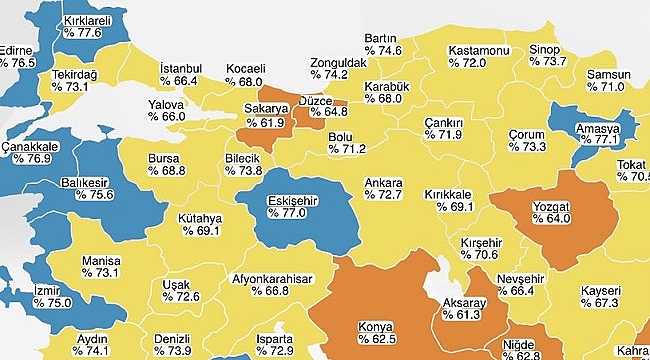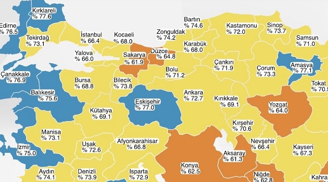 Sağlık Bakanlığı'nın yayınladığı son resmi verilere göre, düzce ikinci doz aşılama oranında istenilen hedefe ulaşamadı.Düzce, ikinci dozda yüzde 64,8'lik oranla turuncu renkli iller kategorisinde yer aldı. Turuncu renk, yüksk risk düzeyini işaret ediyor.Bİrinci doz aşılamada yüzde 82'nin üzerine çıkan Düzce'nin, ikinci doz aşılamada da yüzde 75 oranının üzerine çıkması gerekiyor.İkinci doz aşılama oranı Türkiye genelinde yüzde 70,18 oranına ulaşırken, birinci doz oranı ise yüzde 86,10 oldu.