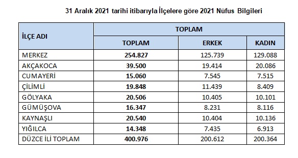 Türkiye İstatistik Kocaeli Bölge Müdürlüğünce açıklanan verilere göre, düzce ilinde ikamet eden nüfus,5 bin 297 kişi artarak, 31 Aralık 2021 tarihi itibarıyle 400 bin 976 oldu.Nüfus yoğunluğu olarak tanımlanan “bir kilometrekareye düşen kişi sayısı" 2021 yılında Düzce ilinin nüfus yoğunluğu 156 oldu.2021 yılında Düzce’nin yıllık nüfus artış hızı ise binde 13,3 olarak gerçekleşti.Düzce ve ilçelerindeki toplam nüfus ile kadın ve erkek nüfusu şöyle oldu: