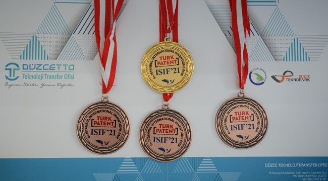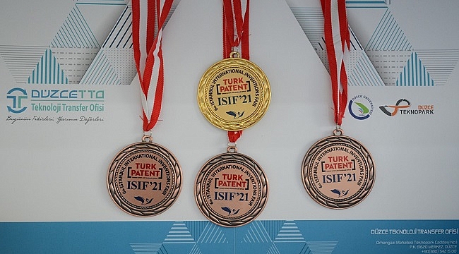 Dünyanın en büyük havacılık, uzay ve teknoloji festivali TEKNOFEST 2021 kapsamında; Uluslararası Buluşçular Birliği Federasyonu (IFIA) ve TÜRKPATENT iş birliğinde düzenlenen 6. İstanbul Uluslararası Buluş Fuarı ISIF'21'de, düzce Üniversitesi, 1 altın 3 bronz madalya alma başarısını gösterdi.Uluslararası alanda 20 farklı ülkeden, 72’si yabancı, toplam 254 buluşun yer aldığı 6. İstanbul Uluslararası Buluş Fuarı ISIF'21’de, Düzce Üniversitesi öğretim elemanları yaptıkları özgün çalışmalarla madalya almaya hak kazandı.“Poliüretan Bazlı Yeni Bir Kompozit Panel” başlıklı çalışmasıyla Düzce Üniversitesi Öğr. Gör. Dr. Emrah Yılmaz altın madalyanın sahibi olurken, Arş. Gör. Dr. Memiş Akkuş, “Tarımsal Atıkların 3d Yazıcılarda Kullanılan Filament Üretiminde Değerlendirilmesi”, Prof. Dr. Resul Kara ve Umut Çelik, “İşitme Engelliler İçin Bir Giyilebilir Kıyafet Sistemi”, Doç. Dr. Meral Kekeçoğlu, Doç. Dr. Haydar Göksu, Öğr. Gör. Gülşah Aydın, Öğr. Gör. Neslihan Şirin, Öğr. Gör. Tuğba T. Akçay, Öğr. Gör. Dr. Nisa Sipahi ise “Propolis Doğal Koruyucusu ve Sarı Kantaron Yağının Bitkisel Krem Üretiminde Kullanımı” başlıklı çalışmalarıyla bronz madalyanın sahibi oldular.