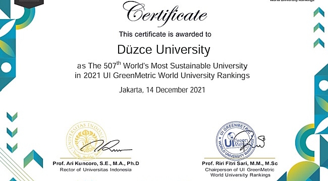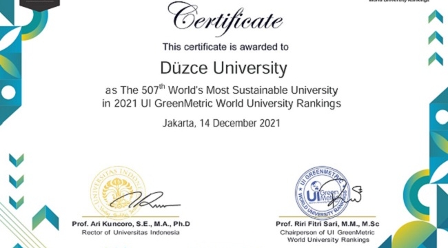 Çevre düzenlemesi, enerji, iklim değişikliği, atık, su, ulaşım, eğitim ve karbon ayak izi ölçümleri gibi farklı alanlardaki çeşitli kriterlere göre sıralama yapan GreenMetric Endeksi’nde düzce Üniversitesi yine yerini aldı.Dünyadan ve ülkemizden binlerce üniversitenin yer aldığı GreenMetric Endeksi’nde 2018, 2019 ve 2020 yıllarında da listeye girmeyi başaran Düzce Üniversitesi, 2021 yılında yine kendisine ön sıralarda yer buldu. Dünya sıralamasında 2020 yılında 645. sırada olan Düzce Üniversitesi bu yıl 138 basamak birden yükselerek 507. sıraya yerleşti. Ülkemizden ise 71 üniversitenin değerlendirilmeye alındığı GreenMetric Endeksi’nde, Düzce Üniversitesi 39. sırada yer alma başarısını gösterdi.Sürdürülebilir bir yaşam için katma değerli akademik çalışmaların yanı sıra Temiz Üniversite-Temiz Düzce gibi sosyal sorumluluk faaliyetleriyle de yeşil ve temiz kampüs çalışmalarını sürdüren Düzce Üniversitesi, yaptığı çalışmalarla da uluslararası sıralamalarda adını duyurmaya devam ediyor.