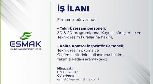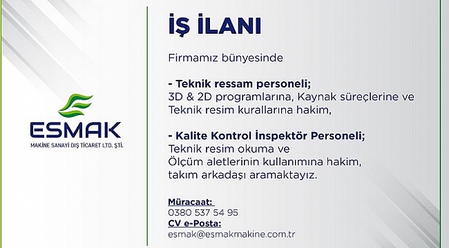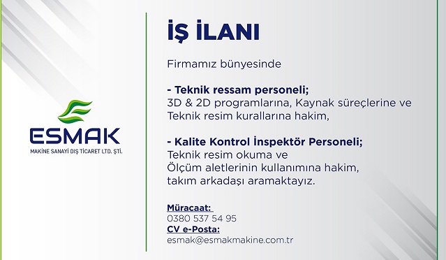 Esmak Makine Teknik Ressam ve Kalite Kontrol İnspektör personeli arıyor