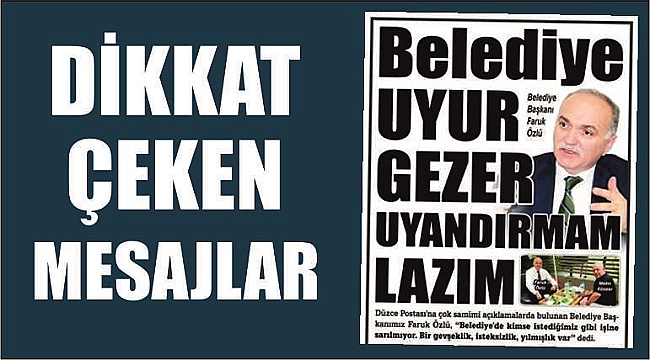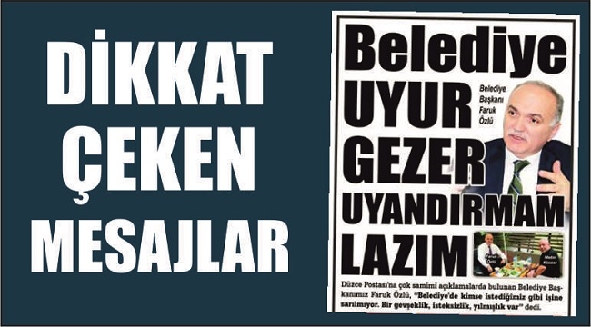 Düzce belediye Başkanı Faruk Özlü, belediye yönetimi ve personele yönelik görevden alma ve işten çıkartma operasyonu yapacağının sinyalini verdi.Düzce Postası’nda yayınlanan habere göre, Özlü belediye çalışanlarına ilişkin şu mesajları verdi:-Belediye personelinden beklediğim performansı alamıyorum. Sanki uyurgezer gibi çalışıyoruz. Kimse istediğimiz gibi işine sarılmıyor. Bir gevşeklik, isteksizlik, yılmışlık var. Mesai dolsa da gitsek havası var, yıllardır gevşek çalışılmış. Bir an önce uyanmamız lazım. Emekliliği geçmiş olan 60’a yakın personelimiz var. Bunlardan istediğimiz verimi alamıyoruz, sırası ile emekli edeceğiz. -Bana çok yumuşak yüzlüsün, çok naziksin diyenler var. Masaya yumruğunu vur diyorlar. Bu saatten sonra katı kararlar alacağım. Dürüstlüğümden ödün vermem. faruk Özlü dün neyse, bugün de öyledir.-Bana gelen şikayetlerin başında halktan uzak olduğum söyleniyor. Ben farkında değildim. Oysa her zaman ziyaretlerde bulunurum. Bakın bugün de sizin yanınıza geldim. Bundan sonra önemli işlerim olmadığı sürece her gün 1-2 saatimi düzce halkına ayıracağım.-Son zamanlarda makam arabalarının sağda solda cirit attığı söyleniyor. Hem hizmet yok, hem borç var, hem de makam arabaları cirit atıyor, sefa sürüyorsunuz diyenler var. Hizmet dışında kullanıldığını zannetmiyorum. Bunun da çaresine bakarız.-Göreve geldikten sonra bazı arkadaşlarımı yanımda görmek istedim. İlerleyen günlerde ne olur bilemem. Herkesin performansı benim için önemlidir. Gelişmeleri takip edeceğim. Ona göre ne gerekiyorsa yapılır.-Göreve geldiğimde bazı araştırmalar yaptım. Bir sürü personel alınmış, ne iş yaptıkları belli değil. Hemen gönderin dedim, efendim şunun kızı, bunun tanıdığı, şu esnafın akrabası falan dediler. Ağzımdan çıkan tek kelime şuydu: Gönderin… Yine gözümüze çarpan performansı düşük personeller var. Her şeyin zamanı var. Fuzuli maaş verecek gücümüz yok.Göreve geldiğimizden bu yana Düzce AKP’den olumsuz veya olumlu hiçbir şey gelmedi. Şunu işe al, bunu çıkar, şöyle yap, böyle yap diyen olmadı. Kimse bizim işimize karışmıyor. Söylentilerin aslı yoktur.Eski adı Yeypaş yeni adı Beltur şirketine atamalar yaptım. Yeni yönetim oluşturduk. Hiç biri maaş almıyor. Fevai Arslan’ı niye aldın diyorlar. Fevai bey 1 lira maaş almıyor. İşi bildiği için, yardımcı oluyor.