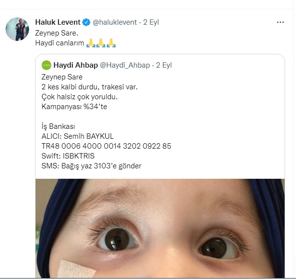 Ahbap Derneği kurucusu ünlü sanatçı Haluk Levent Düzceli Zeynep Sare için yardım çağrısında bulundu.