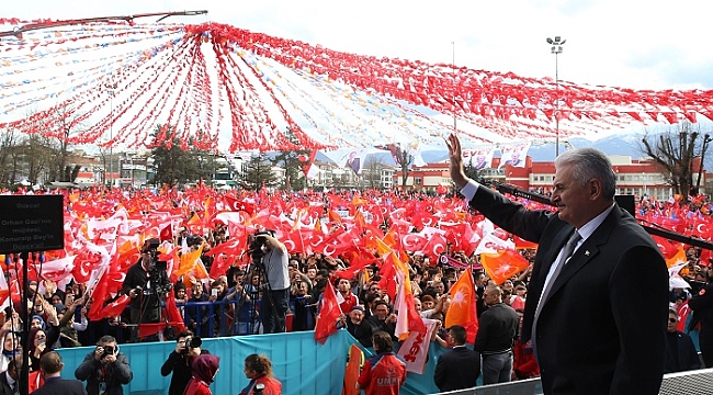 Sistemin bozukluğunun buradan belli olduğunu ifade eden Başbakan Binali Yıldırım, “Milletin kendisini temsil etme yetkisiyle meclise yolladığı vekiller, Cumhurbaşkanını seçemiyor. Millet doğrudan sandığa gidiyor, Cumhurbaşkanını seçiyor. Yetmedi e-muhtıralarla millete ayar veriyorlar. 17-25 Aralık kumpası ile hükumeti al aşağı etmek, Cumhurbaşkanını görevden uzaklaştırmak istiyorlar. Yetmedi altın vuruşlarını 15 Temmuz’da vurmak istiyorlar. Bu millet tankların, mermilerin, uçakların önüne göğsüne siper ederek alçaklara dünyayı dar ediyor. Hakkın ve halkın gücü tankın gücünü al aşağı ediyor. Demokrasinin zincire vurulmak istediği o gün her gencimiz birer Ulubatlı Hasan, her kadınımız Nene Hatun oldu. Vatanın, Cumhurbaşkanının demokrasinin yanında durarak meydanları doldurdunuz. Şehitler verdik, gazilerimiz oldu. Çanakkale’de ecdadı selamlayarak şahadet şerbetini içtiniz. Bu gençliğe siyaseti çok gören Kılıçdaroğlu dinle. Demek ki birileri darbe anayasasının mevcut sisteminden nemalanıyor. Millete devamlı aba altından sopa gösteriyorlar. Yaptığımız bu değişiklik ile beraber temsil sorunlarını, siyasi tıkanıklıkları artık geride bırakacağız. Yeni anayasa kutuplaşma yerine kucaklaşmayı öngören, çatışma yerine birlikte çalışmayı sağlayan bir anayasa olacak. İstiyoruz ki artık hep baharı yaşayalım. Çocuklarımız, gençlerimiz umut dolu yarınların inşa edildiği bir sistemde yaşasın” şeklinde konuştu.