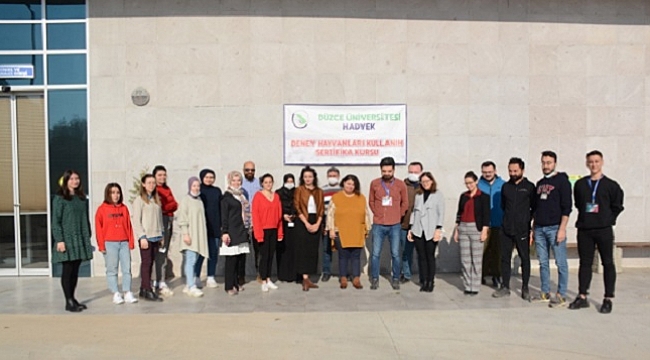 Düzce Üniversitesi hayvan Deneyleri Yerel Etik Kurulu ve deney Hayvanları Uygulama Araştırma Merkezi (DÜDAM) tarafından “III. Deney Hayvanları Kullanım Sertifikası Kursu” düzenlendi.DÜDAM Müdürü Doç. Dr. Merve Alpay'in koordinatörlüğünde yürütülen eğitimlerde, Düzce Üniversitesi öğretim üyeleri, tıpta uzmanlık, doktora, yüksek lisans öğrencileri ve kurum dışından gelen araştırmacı bilim insanları, deney hayvanlarının araştırmalarda kullanırken dikkat edilmesi gerekenler hakkında, konunun uzmanları tarafından bilgilendirildi.İki hafta süresince kurs gören katılımcı 27 kursiyer, merkezimiz tarafından yapılan sınav sonucunda başarılı olanlar, deney hayvanları kullanım sertifikası almaya hak kazandı. Kursiyerler aldıkları bu sertifika ile deney hayvanları üzerinde bilimsel çalışmalar yapabilme yetkinliğine sahip oldular.