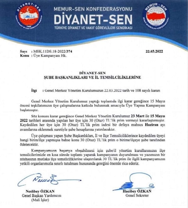 Memur-Sen'e bağlı diyanet Sen tarafından Türkiye genelindeki il ve ilçe temsilciliklerine gönderilen talimatta, 15 Mayıs tarihine kadar il ve ilçe şubelerinde yeni üye yapan veya bir başka sendikada bulunan üyeyi Diyanet-Sen’e çeviren temsilcilere her bir üye için kişi başı 30 TL prim vaat edildi.Dİyanet bünyesinde faaliyet göstenen Diyanet Mil-Sen ile Diyanet Birlik Sendikası promosyonlu üye kampanyasına tepki gösterdi.Düzce Diyanet Sen Şubesi sosyal medya hesabından yaptığı açıklamada, "Biz kimseyi satın almaya talip değiliz, sizin gibi iftira etmeyiz, iftiralarınıza sabreder cevap bile vermeyiz. Her kurum temsilcilerinin performans ve çalışmalarının daha verimli olması için sendikal faaliyetlerde kullanılmak üzere kaydedilen Her üye için 30 TL pirim verip sendika hesaplarına destek çıkmalarından daha doğal ne olabilir. Yönetim kadrosu olarak size yakışanı yapıp bütün din görevlilerine yapılabilecek en büyük hakareti yaptınız. Bu mudur sizin milli manevi sendikacılık anlayışınız. Yönetim kadronuz dan diyanet sen ve din görevlilerinden özür dileme erdem ve olgunluğunu göstereceğinizi umut ediyor saygılar sunuyorum" ifadelerini kullandı.Diyanet Mil- Sen Genel Başkanı Celalettin Gül, sosyal medya hesabından "Yetkili(!) sendika etkisiz kalınca ve üye kaybetmeye başlayınca, ekte görüldüğü üzere şimdi de 30 TL karşılığında üye avcılığına başladı. Manevi, İlkeli ve Liyakatli sendika olarak bir kez daha " Önce Ahlâk ve Maneviyat"a davet ediyoruz" ifadelerini kullandı. Diyanet Sen'in şubelere gönderdiği o yazı şöyle: