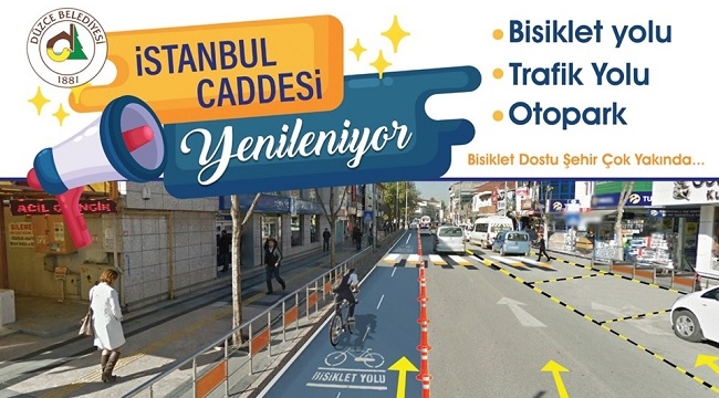 Düzce'nin kent merkezini ikiye bölen ve hem yaya, hem araç trifiğinin en yoğun olduğu İstanbul caddesinin akibeti belli oldu.Belediye, İstanbul Caddesi için hazırlanan proje hakkında açıklama yaptı. Böylece caddenin uzun süredir merak edilen akıbeti belli oldu. Proje kapsamında şehir merkezinde araç kullanımı yerine bisiklet kullanımının özendirilmesine yönelik bir çalışma yapılacak.Bİlindiği gibi, İstanbul caddesi Mehmet Keleş döneminde kent merkezinin yayalaştırılması kapsamında araç trafiğine kapatılmıştı. Caddeye tramvay hattı döşenmiş ve yaklaşık 2 milyon lira yatırım yapılmıştı.Keleş'en sonra görevi devr alan Dursun Ay caddeyi yeniden trafiğe açtı ve tramvay seferlerini durdurdu. Belediye Başkanı Furuk Özlü ise tramvay projesini tümüyle ortadan kaldırarak, caddenin araç trafiğine açık olmasına, tramvay hattına bisiklet yolu yapılmasına karar verdi.