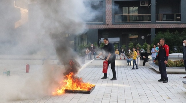 İtfaiye, Kültür Mahallesinde bulunan bir sitede yangın bilinci eğitiminde hem teorik hem de uygulamalı müdahale tedbirlerini anlattı.
