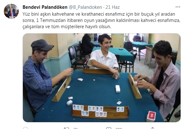 Türkiye esnaf ve Sanatkar Odaları Birliği Genel Başkanı Bendevi Palandöken, sosyal medya hesabından yaptığı açıklamada, "Yüz bini aşkın kahvehane ve kırathaneci esnafımız için bir buçuk yıl aradan sonra, 1 Temmuzdan itibaren oyun yasağının kaldırılması kahveci esnafımıza, çalışanlara ve tüm müşterilere hayırlı olsun"Palandöken'in açıklaması şöyle: