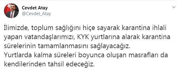 Vali Atay'ın sosyal medya hesabından yaptığı paylaşıma vatandaşlardan destek geldi.Vatandaşlar, koronaüvirüs önlemlerinin daha sıkı uygulanmasını isteyerek, özellikle toplu taşıma araçlarında ayakta fazla yolcu alınmasının önlenmesine yönelik denetim yapılmasını istediler.