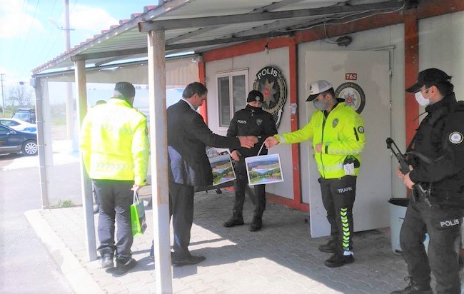 Şahin, ilçe giriş çıkış trafik kontrol noktasında görev yapmakta olan polislere ziyaretleri de ihmal etmiyor.