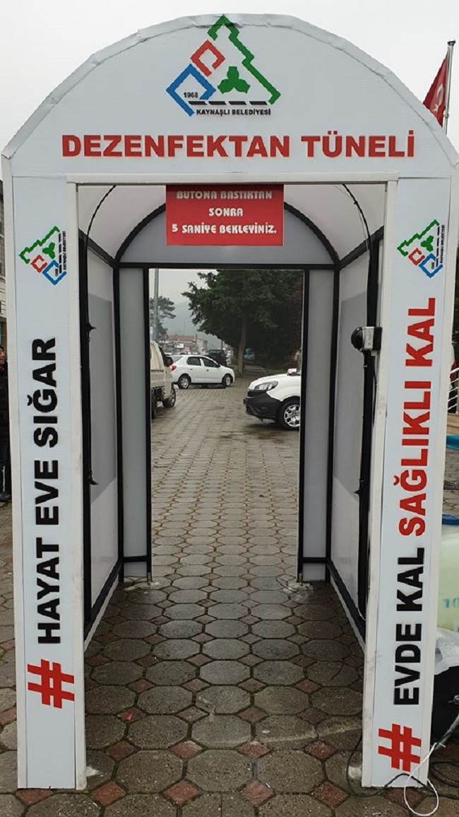 Kaynaşlı’da belediye tarafından Corona Virüsten korunmak için dezenfeksiyon tüneli oluşturuldu, ortak kullanım alanları ekipler tarafından dezenfekte edildi, ihtiyaç sahibi vatandaşlara gıda yardımı yapıldı, maskeler işyerlerine, evlere dağıtıldı, suya yüzde 80 indirim yapıldı. Sokağa çıkmak zorunda kalanların evlerine dönüşleri sırasında içine girdikleri tünelde yayılan özel karışımlı kişilerin kıyafetleri üzerindeki olası bakterilere karşı dezenfekte tüneli kaynaşlı belediyesi önüne kuruldu.