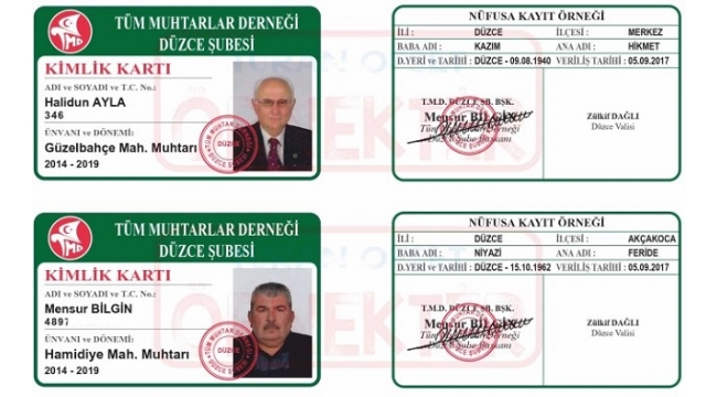 Düzce Belediyesi Muhtarlık İşleri Müdürlüğü tarafından 56 merkez mahalle muhtarı için kimlik kartı hazırlandı. Kimlik kartlarında Tüm Muhtarlar Derneği başlığı altında muhtarların T.C. numaraları ile nüfusa kayıt örneği bilgileri yer alıyor.