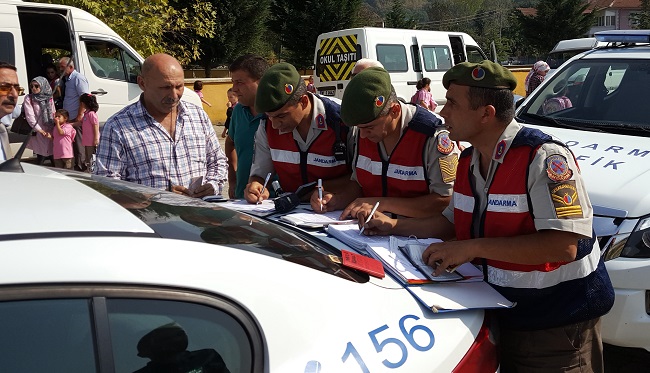 Düzce’de okul servislerine yönelik İl jandarma Komutanlığı Trafik ekiplerinin denetimleri bütün hızıyla devam ediyor. Özellikle ilkokul ve ortaokul öğrencilerini taşıyan servislere yönelik yapılan uygulamalarda zaman zaman 'Bu kadar da olmaz' dedirten görüntüler yaşanıyor. Beyköy Beldesi'nde İl Jandarma Alay Komutanlığı Trafik ekipleri, Şehit Ufuk Baysan İlkokulu önünde servis araçlarına yönelik uygulama yaptı. Denetimler esnasında servis araçlarında öğrencilerin emniyet kemeri takıp takmadıklarını kontrol eden jandarma ekipleri, bir servis aracına ilkokul öğrencilerinin balık istifi bindirildiğini fark etti. 17 koltuğu olan servis aracına velilerin gözü önünde 32 öğrenci bindiren servis şoförüne jandarma tarafından cezai işlem uygulandı. Uygulama yapan jandarma ekipleri, çocukları ile birlikte servisi bekleyen aileleri de uyararak, kurallara uygun öğrenci taşımayan servis araçlarına çocukların bindirilmemesi gerektiğini anlattı. Öğrencileri balık istifi taşıyan servis sürücüsüne bin 14 TL ceza kesildi.