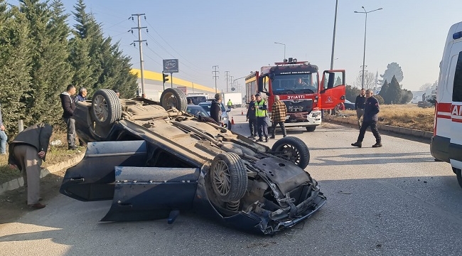 Çerkez Taşköprü sapağında meydana gelen kazada yolun sağında bulunan otomobile çarpan başka bir otomobil, orta refüjde bulunan kaldırım taşlarına çarparak ters döndü.