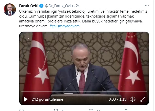 Faruk Özlü, Bilim, Sanayi ve Teknolojii Bakanlığı görevinden ayrılalı yaklaşık 3 yıl oldu.Özlü, sosyal medya hesaplarından, bakan olduğu dönemde bir törendeki konuşmasının görüntülerini yayınladı.Özlü, "Ülkemizin yarınları için ‘yüksek teknoloji üretimi ve ihracatı’ temel hedefimiz oldu. Cumhurbaşkanımızın liderliğinde, teknolojide sıçrama yapmak amacıyla önemli projelere imza attık. Daha büyük hedefler için çalışmaya, üretmeye devam. Çalışmaya devam" notuyla paylaştığı görüntüde, "Bütün proje yönetim süreçlerinde görev yaptığım Türkiye'nin ilk milli tanık Altay'ı, ilk savaş gemisi Milgem'i, ilk insansız hava araçları olan anka ve Bayraktar'ı, ilk eğitim uçağı Hürkuş'u, ilk helikopter Atak'ı Sayın Cumhurbaşkanımızın himayelerinde ve desteklerinde hayta geçirdik" ifadelerini kullandı.Özlü, video paylaşımının devamında ise, yerli otomobille ilgili değrelendirmeler yaptıktan sonra, "Verdikleri destekten dolayı sayın başbakanımıza ve cumhurbaşkanımıza teşekkür ediyorum" dedi.Özlü'nün, bakan olduğu dönemde icraatlarıyla ilgili yaptığı bir konuşmayı yeniden gündeme getirmesi dikkat çekti.İşte o paylaşım: