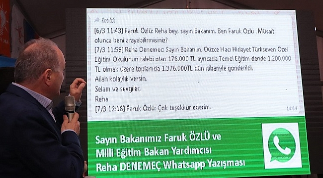 65. Hükümet Bilim Sanayi ve Teknoloji Bakanı AK Parti düzce Belediye Başkan Adayı Dr. faruk Özlü “Konuşuyorlar ama Düzce’ye bir dikili ağaçları yok. Konuşma öyle olmaz, biz bir mesaj ile Düzce de bir okulun ihtiyacı için toplamda 1 milyon 376 bin TL para getirdi. Konuşma böyle olur” dedi.