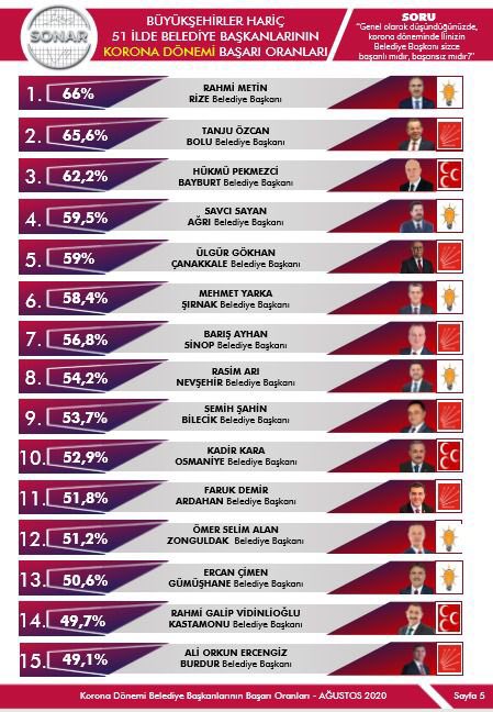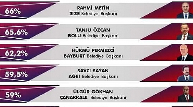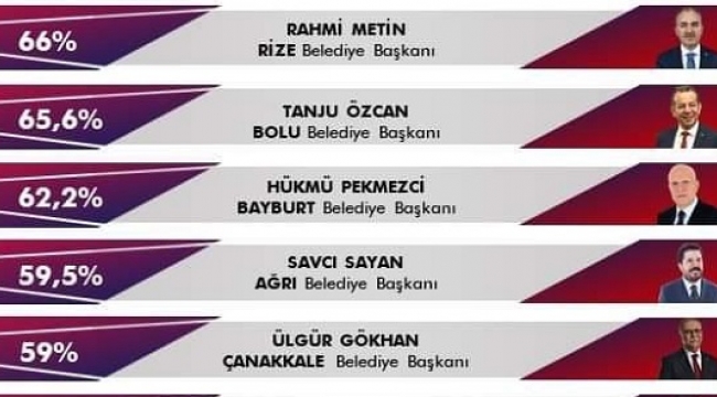 Kamuoyu araştırma şirketi sonar tarafından Türkiye genelinde yapılan araştırmaya göre, büyükşehirler arasına en başarılı belediye baqşkanı İstanbul Belediye Başkanı Ekrem İmamoğlu oldu.İller bazında ise en başarılı belediye başkanı Rize Başkanı Rahmi Metin olurken, Bolu Belediye Başkanı Tanju Özcan ikinci seçildi:İşte anket sonucu: