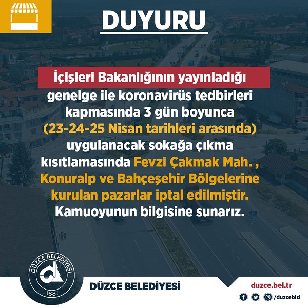 Düzce Belediyesi, Konuralp, Bahçeşehir ve Fevzi Çakmak mahallelerinde kurulan pazarların, sokağa çıkma kısıtlaması sebebiyle iptal edildiğini duyurdu.Belediye'den yapılan açıklamada, cuma, cumartesi ve pazar günleri sokağa çıkma kısıtlaması uygulanacağından dolayı, bu günlerde kurulan pazaryerlerinin iptal edildiği belirtildi.
