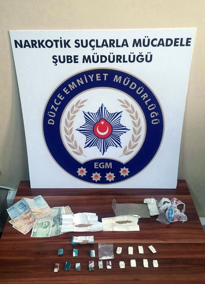 düzce İl Emniyet Müdürlüğü Narkotik Suçlarla Mücadele Şube Müdürlüğü ekiplerinin torbacı tabir edilen sokak satıcılarına yönelik yürütülen çalışmalar çerçevesinde merkez Nusrettin Mahallesinde uyuşturucu madde ticareti yaptığı tespit edilen Afganistan uyruklu M.O., M.H. ve M.A.K. isimli 3 kişiyi yapılan operasyon ile göz altına aldı. Göz altına alınan şahısların evlerinde yapılan aramada ise satışa hazır 9 adet fişek halinde metamfetamin maddesi 12 adet fişek halinde eroin maddesi ile satıştan elde edildiği tahmin edilen 315 TL para ele geçirdi.
