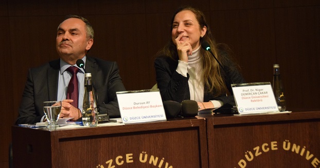 Düzce Belediye Başkanı Dursun Ay, kendilerini Düzce Üniversitesi’ne davet eden Rektör Prof. Dr. Nigar Demircan Çakar’a teşekkür etti. Düzce’nin daha yaşanılabilir kent olması için öğrencilerin sorunlarını ve önerilerini dinlemeye geldiklerinin altını çizen Dursun Ay, Rektör Çakar ile birlikte öğrencilerin soru ve önerileriyle ilgili açıklamalarda bulundu.
