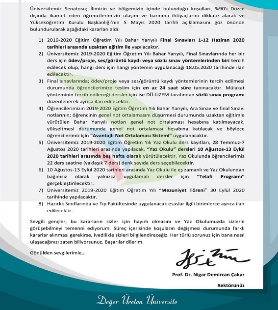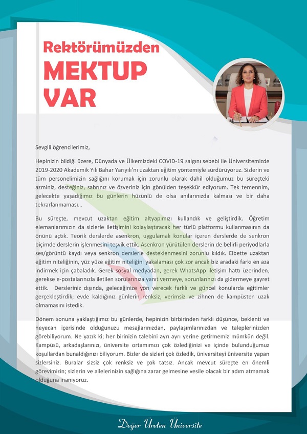 Rektör Çakar, üniversitenin kurumsal ve sosyal medya hesapları ile kişisel sosyal medya hesaplarından paylaşım yaparak, bundan sonraki eğitim süreciyle ilgili öğrencileri bilgilendirdi.Çakar, "Sevgili Gençler, merak ettiğiniz soruların cevabı bu mektupta...Stajlar ile ilgili bir değişiklik yok. Tek/çift sınavlarının nasıl yapılacağına öğrenci sayısını görerek karar vereceğiz. Hepinize başarılar dilerim" dedi.Çakar, mektubunda, "Sevgili öğrenciler, bizler de sizleri çok özledik. Üniversiteyi üniversite yapan sizlersiniz. Buralar sizsiz çok renksiz ve tatsız" ifadelerini kullandı.İşte rektör Çakar'ın mektubu: