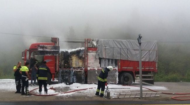 Düzce D-100 karayolu Bolu Dağı mevkisinde seyir halindeki kamyon henüz belirlenemeyen bir nedenden dolayı yandı.