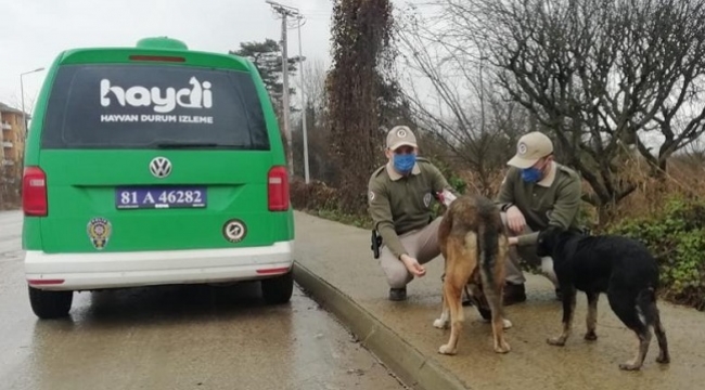 Düzce'de, Emniyet Müdürlüğü ekipleri sokağa çıkma kısıtlamasının uygulandığı hafta sonunda belirli noktalarda sokak hayvanlarını elleriyle beslediler.